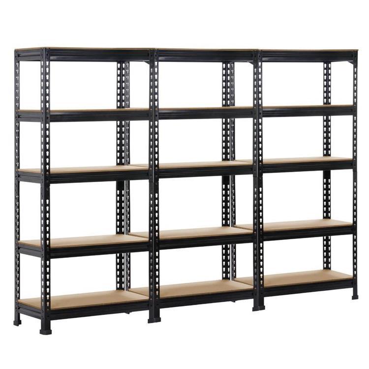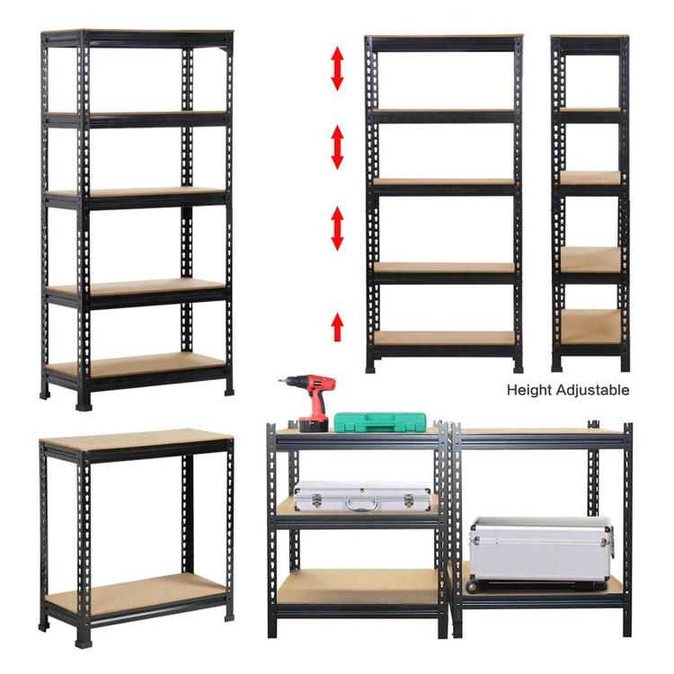 MATERIALS The storage shelves are made of Steel frame for strength and powder coated finish for resistance to corrosion,0.3" E1 MDF board. CAPACITY This shelving storage unit can hold up to 330lbs per shelf.(evenly distributed) RIVET LOCK DESIGN The shelves are supported by double-riveted beams and braces, assembly is no need nuts and bolts, instruction included, a rubber mallet recommended. ADJUSTABLE HEIGHT Height adjustable shelf design suitable for stuff in varied sizes. RUBBER FEET Four rubber feet for safety stability and floor protection. MULTIPLE USES The standing shelving unit are suitable for organized and storing, ideal used in a variety of office, industrial, educational, and residential settings. PACKAGE INCLUDED 3pcs x 5 tier shelf(59.1 x 27.6 x 11.8’’(HxWxD) per unit) Please Note: To help prevent any undesired injury, it is advised to wear gloves during assembling.
