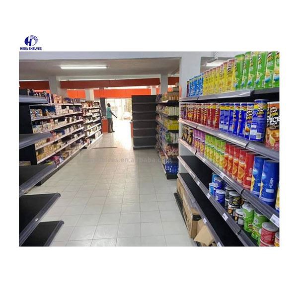 Steel Display Shelving for Groceries Store is the most significant piece of shop equipment, not because most products are displayed on the gondola shelves, but because it is used to create the overall store layout by forming the shelving aisles.