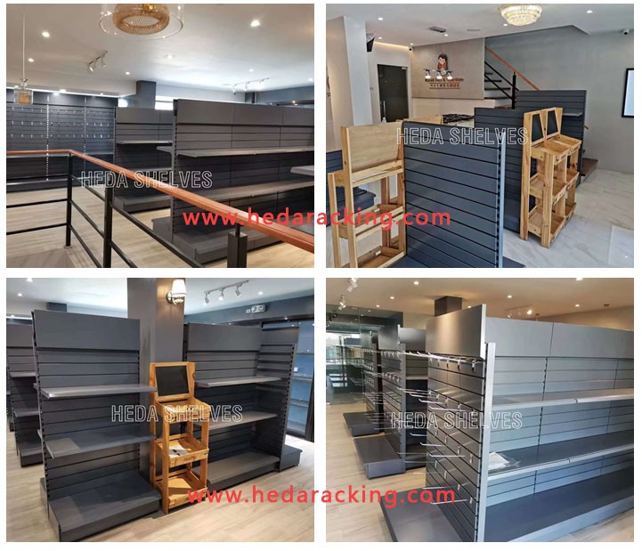 Black supermarket shelves with hook