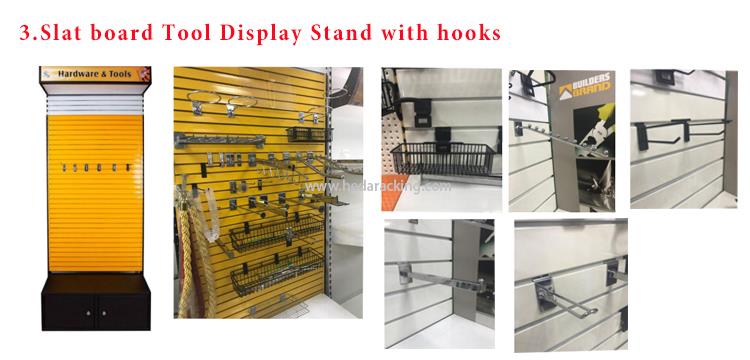 Tool Display Stand can be used with hook,light box (with light or without light), layer board, advertising board,bottom ark etc.We will introduce these three type Tool Display Stands to you, which type you like, pls feel free to contact us.We also can supply you all kinds of rack and shelf , such as warehouse rack,supermarket shelf and so on!