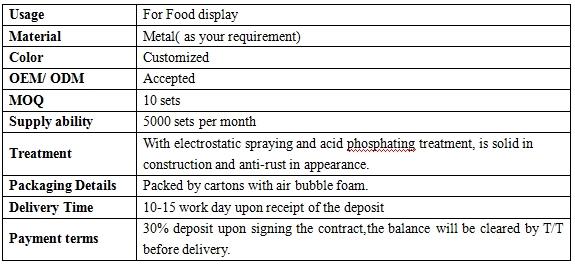 Product name: Food display rack Product description: Company Information: Certificate: FAQ: 1.Q: Are you manufacture or trading company? A: We are a factory specialized in all kinds of supermarket shelves, warehouse racks and different,kinds of display stands. We have over 10 years of experience...
