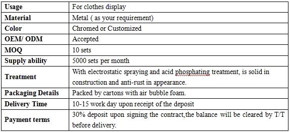 Product name: Garment display racks Product description: Features: 1. Our clothes hanging rail is made of high-quality metal material with black powder coating, environmental-friendly, safe and durable. 2. Strong supporting capability, long-lasting durability, high corrosion resistance and good...
