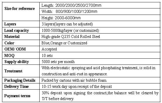 Product name: Industrial shelving Product description: Standard Specification: 1.Custom made of shelves to be well applied in real places. 2.There is adjustable for the level height for the board. 3.Simple design but cover with big load capacity, the maximum up to 5000 kgs/layer. 4.Humanization...