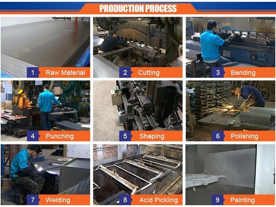 Punching: Through punching machine, to perforate holes to each corner of steel board, this step allow each rack to combine with each other