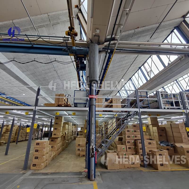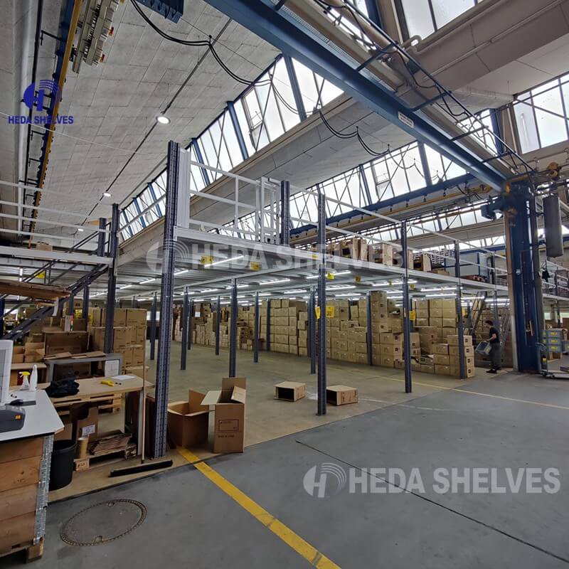 This Warehouse Steel Mezzanine Floor and Platform is built with heavy-duty steel column and H-shaped steel structures, providing further load capacity. Distance between columns can be increased, minimizing the obstruction between post to post