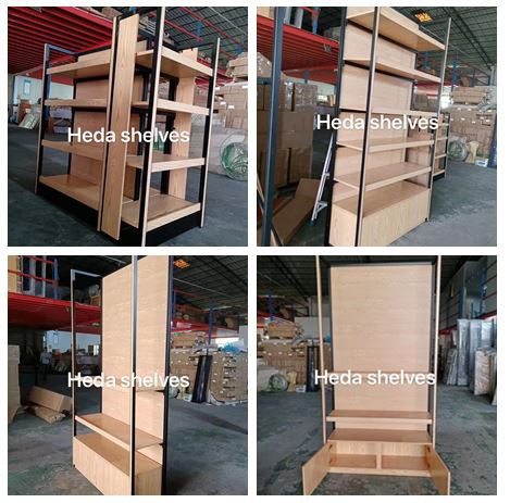 New design wooden and metal shelves for your store. Double-row uprights, no need for screws, bracket type snap-on, easy to install. The Wooden shelves adds steel frame for strong bearing.