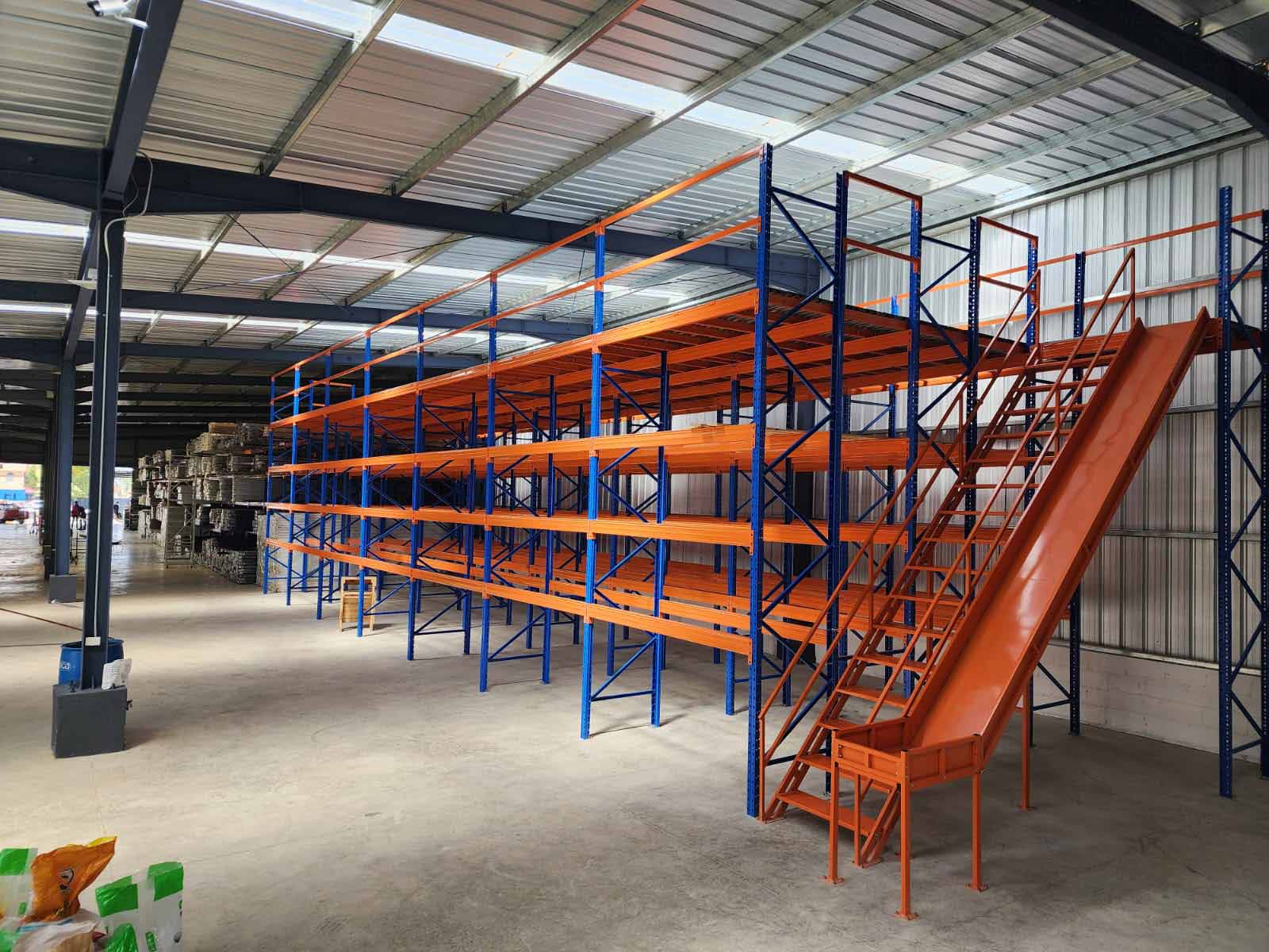 You can add cantilever rack,selective pallet racking,or pick module at the floor layer. Slow-moving goods can be stored on the top tier, while the bottom tier is used for fast-moving goods.