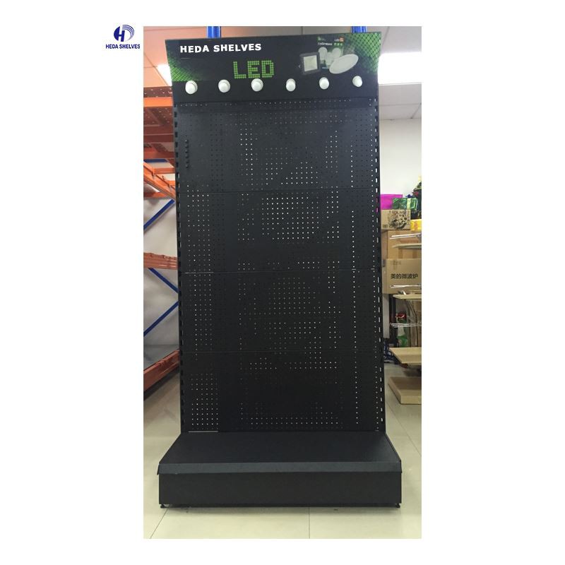 This exhibition display stands is painted black with lights above the display stand. The appearance is very simple and elegant, the load-bearing is about 80kg, and it can place various commodities, such as hardware tools, small electrical appliances, knives, props, etc.