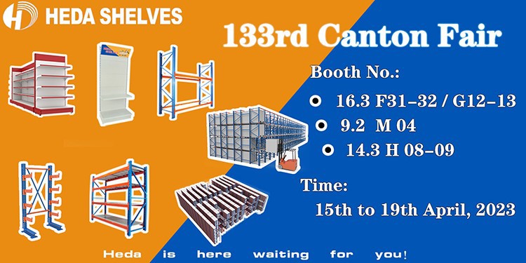 Heda shelves sincerely invite you to visit our Booth (No.: 16.3 F31-32/G12-13, 9.2 M 04 and 14.3H 08-09 ) at The 133rd Canton Fair from 15th to 19th April, 2023.