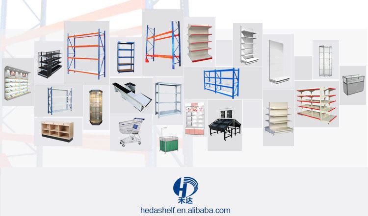 Also Our factory manufacture various supermarket shelf and supermarket equipment , such as supermarket shelf , fruit vegetable shelf , checkout counter , shopping trolley , promotion table , display hook.