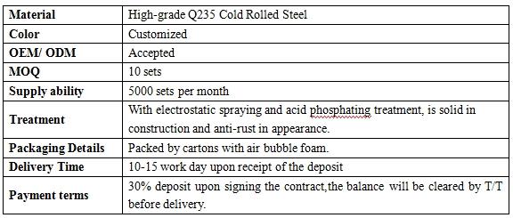 It can be folded together to save space when it is not used. there are 2 kinds: stationary type and detachable type. Station rack is made of formed steel which is stable and durable. Detachable rack is made up with bottom and four veritcal post. the bottom is made of formed steel and the vertical post of square steel.